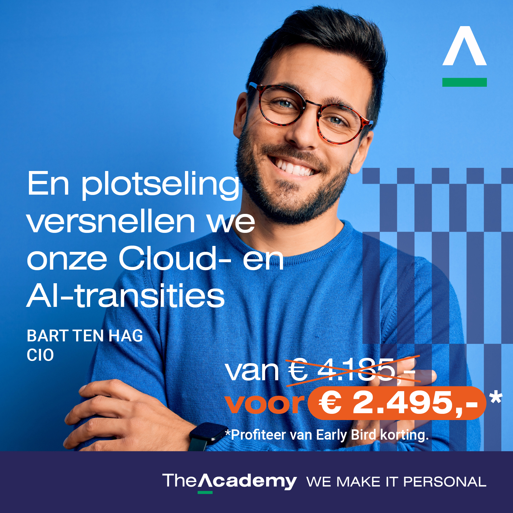 Los van onze flexibele IT-programma’s en leerlijnen zal het je opvallen dat ons trainingsaanbod ongekend groot is. Bij ons raak je dan ook echt nooit uitgeleerd. En dat is precies wat wij beogen met een leven lang leren: jezelf blijven uitdagen, iedere keer weer. Ongeacht je leeftijd, want je bent nooit te oud om iets nieuws te leren. Bij The Academy ben je dan ook aan het juiste adres. En zeker nu, want tot 31 januari 2026 hebben we 11 van onze unieke IT-leerlijnen extra aantrekkelijk geprijsd en betaal je tijdelijk slechts € 2.495,00. Voor vroegboekers hebben we bovendien een Earlybird-bonus in de vorm van een extra keuzevak ter waarde van € 1.795,00. Dus waar wacht je nog op?! Bel ons. We helpen en adviseren je graag.